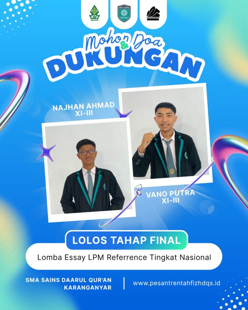 Alhamdulillah Tim Riset SMA Sains Daarul Qur’an Karanganyar berhasil lolos ke Tahap Final Lomba Esai Tingkat Nasional yang diadakan oleh LPM Referrece UIN Walisongo Semarang.