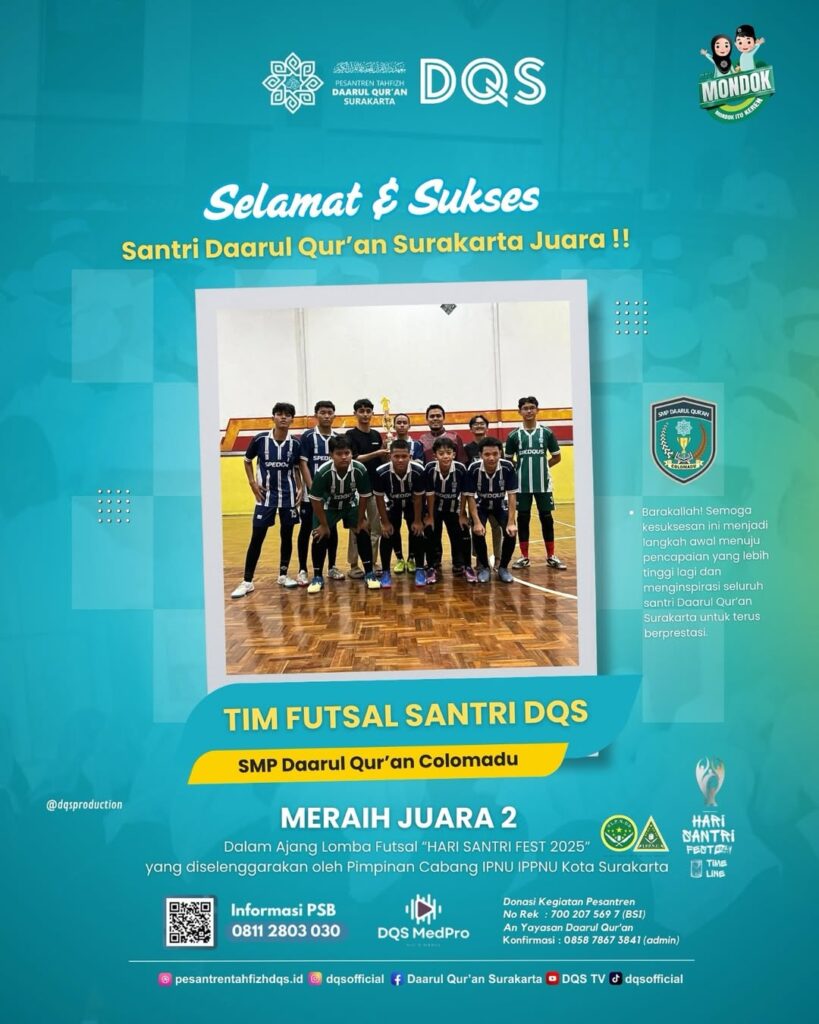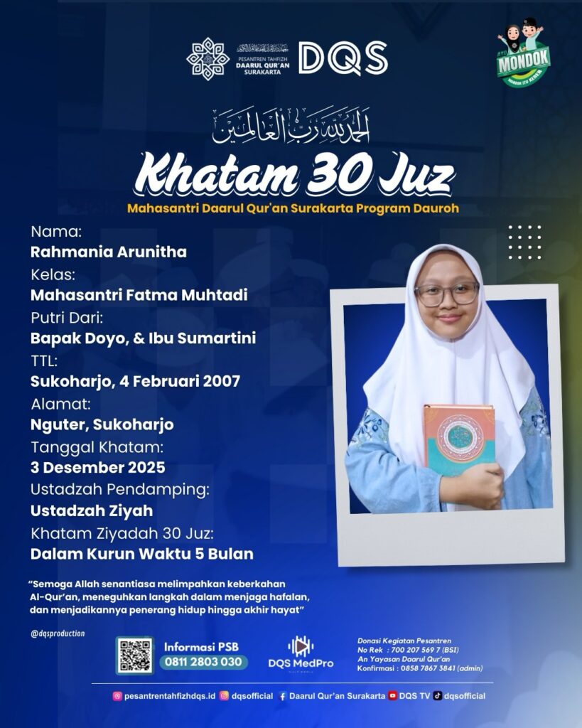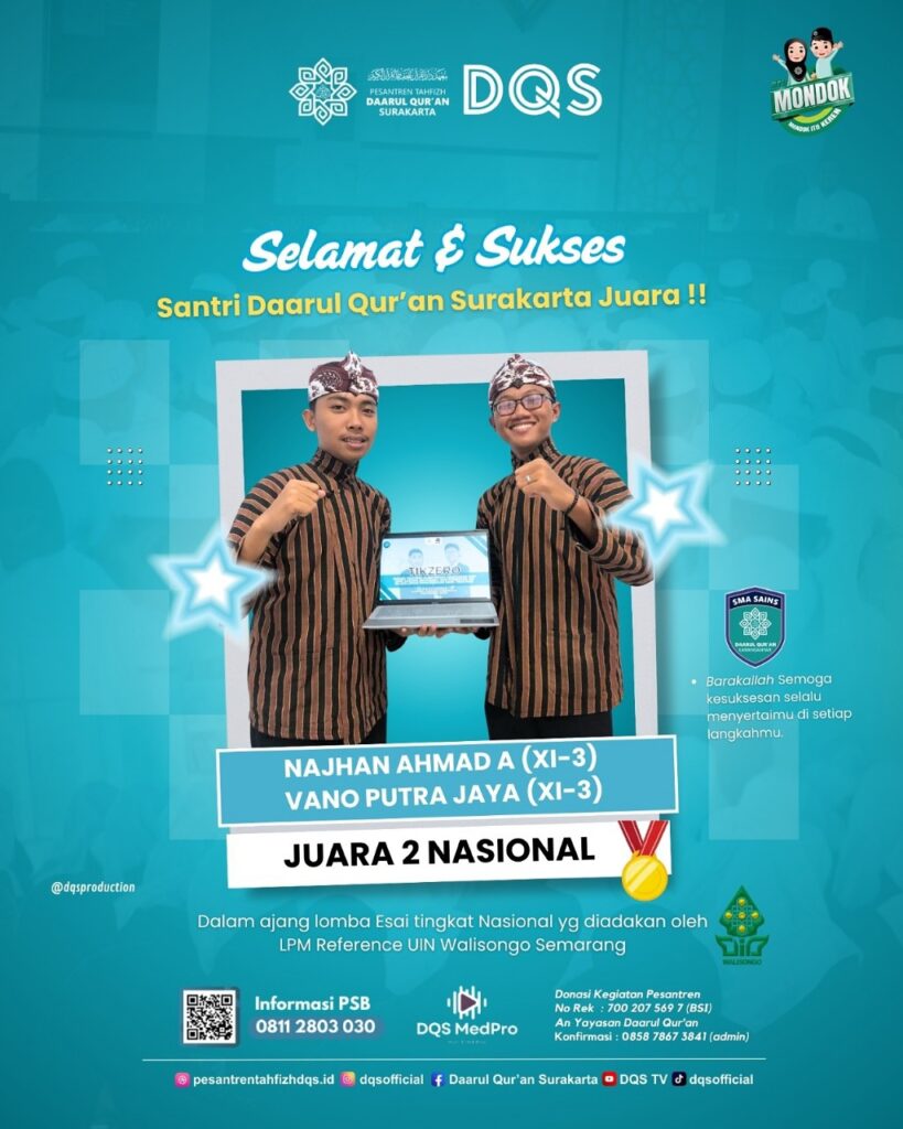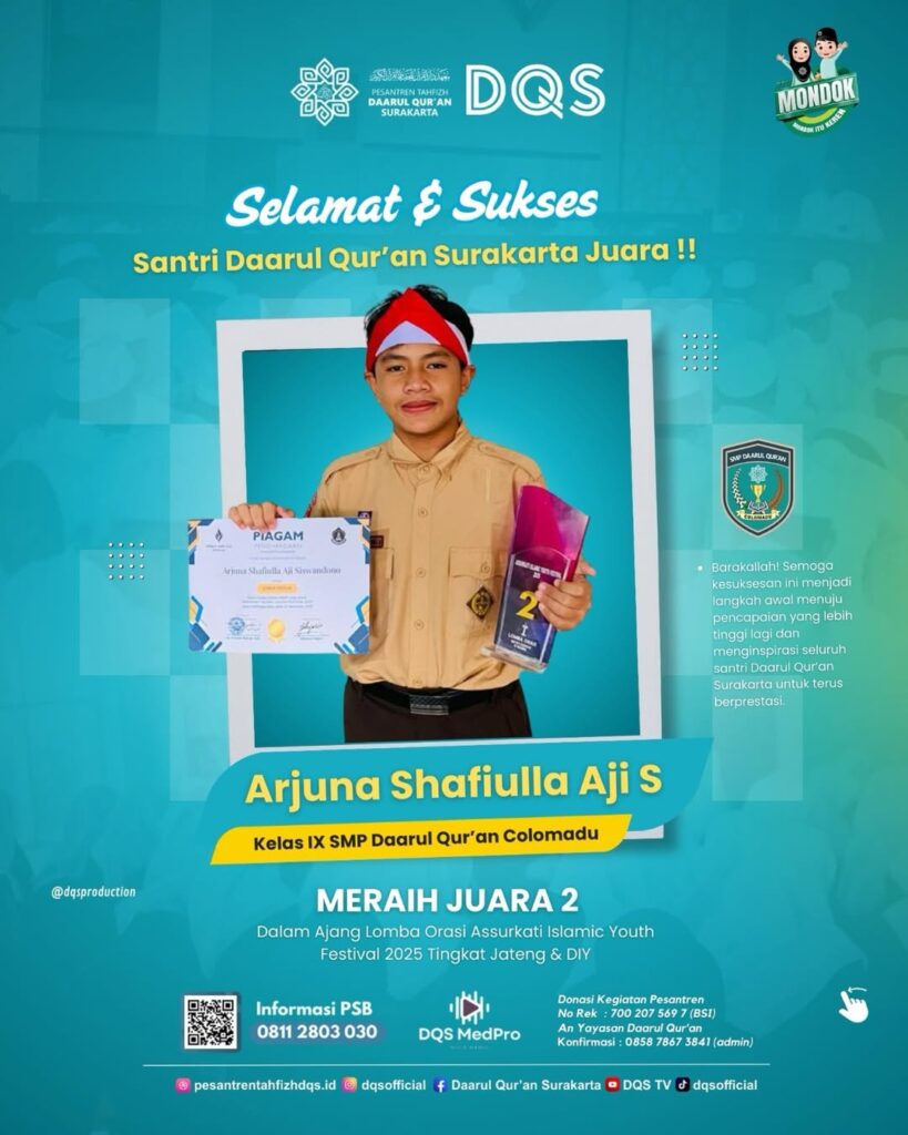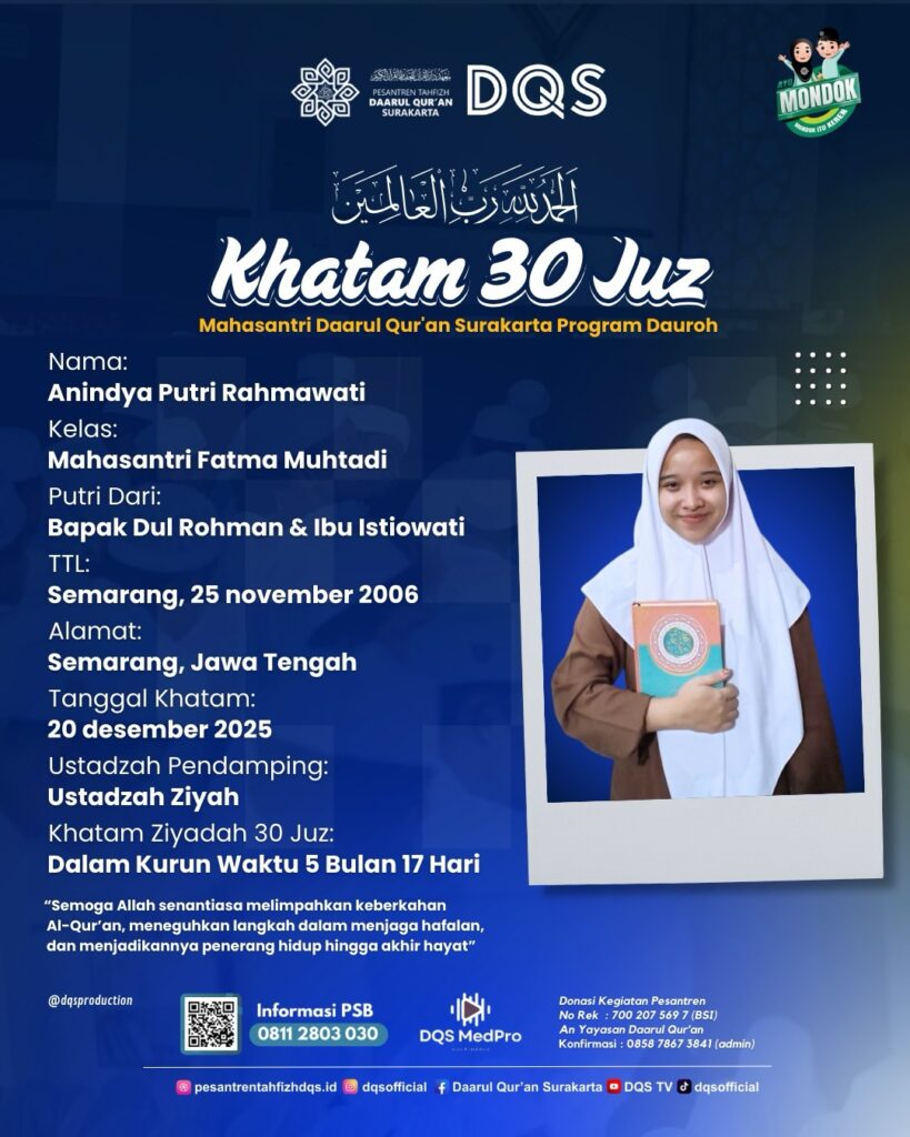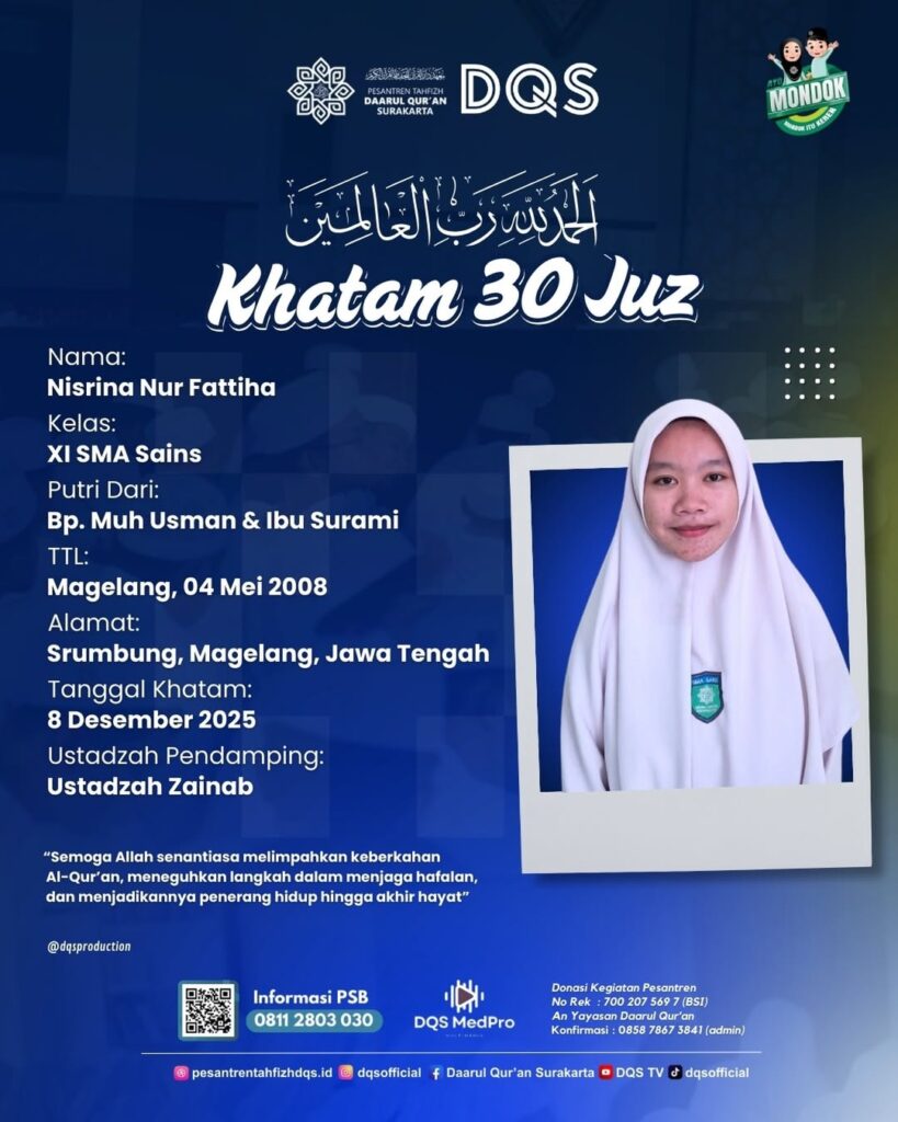 Prestasi Data Prestasi Santri 2025/2026 Data Terbaru Hafizh 30 juz Tahun 2025/2026 Data Terbaru Tahun 2024/2025 Data Terbaru Tahun 2023/2024 Hafizh 30 Juz Tahun 2023/2024 PRESTASI ALUMNI DAARUL QUR'AN SURAKARTA